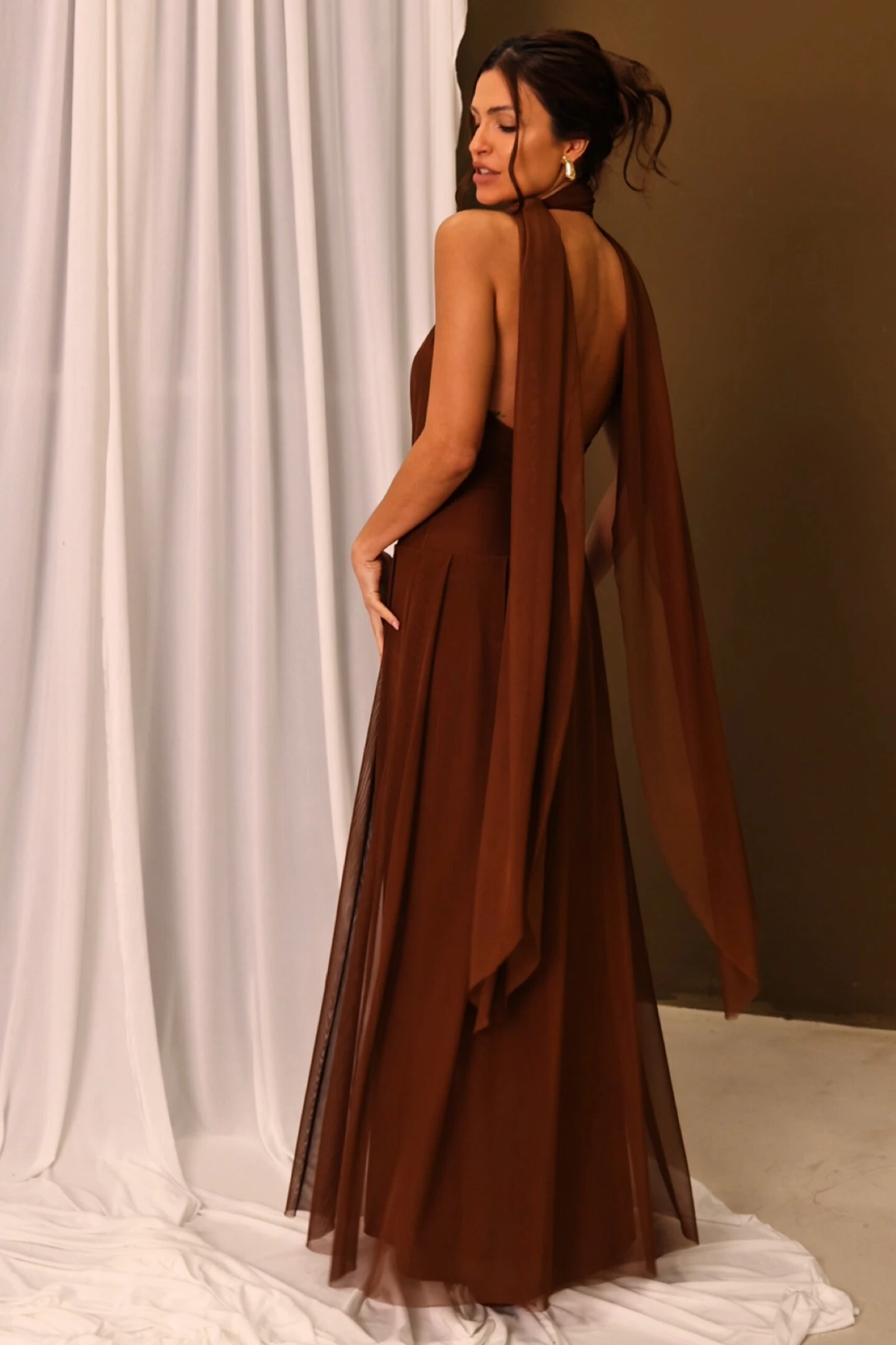 Vestido longo em tule; modelo frente única / costas aberta. Acompanha lenço faixa.
