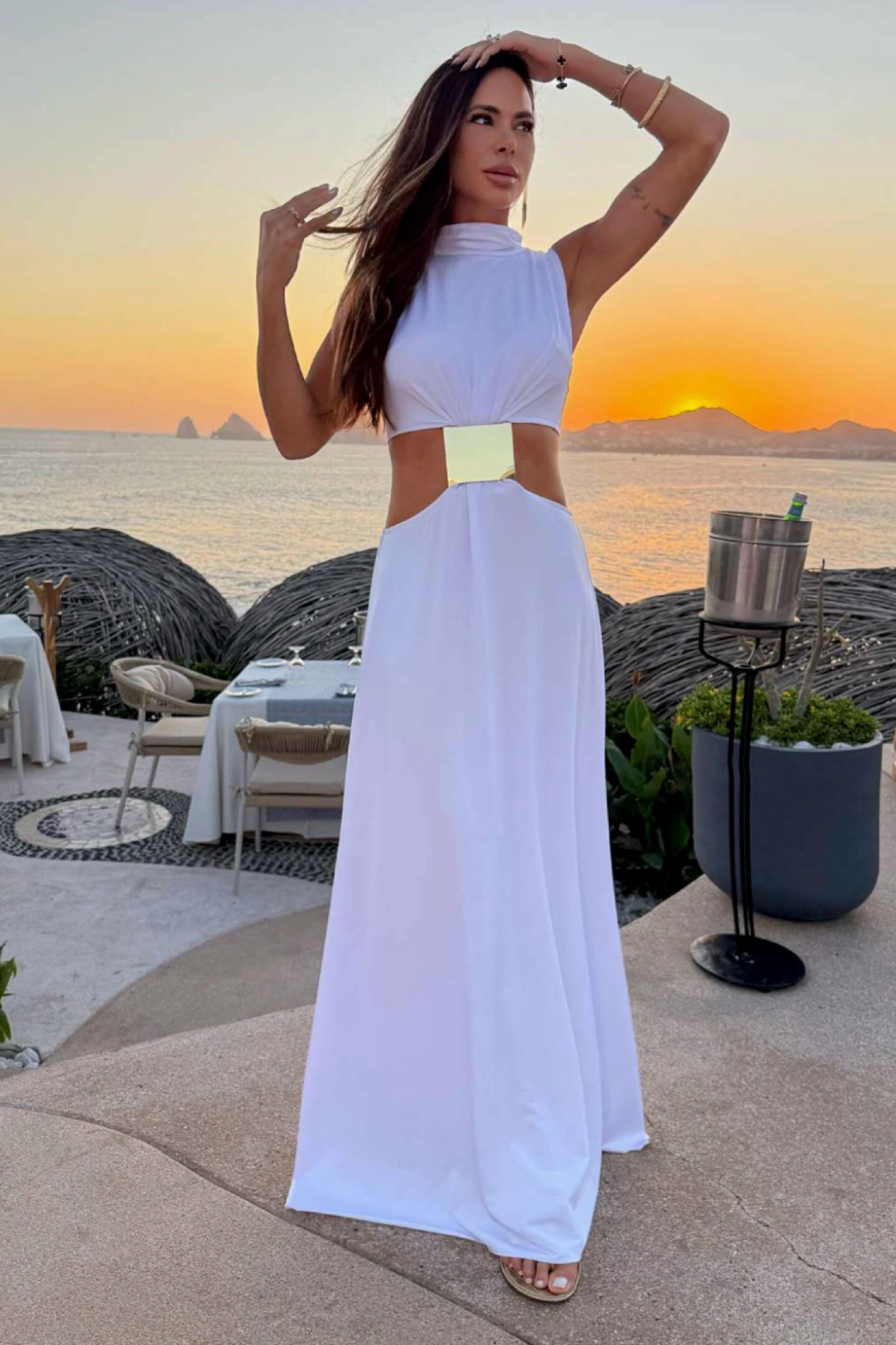 Cintura vazada e saia levemente rodada. O destaque da peça se dá pelo aviamento dourado central da peça, que traz um toque refinado para o todo.