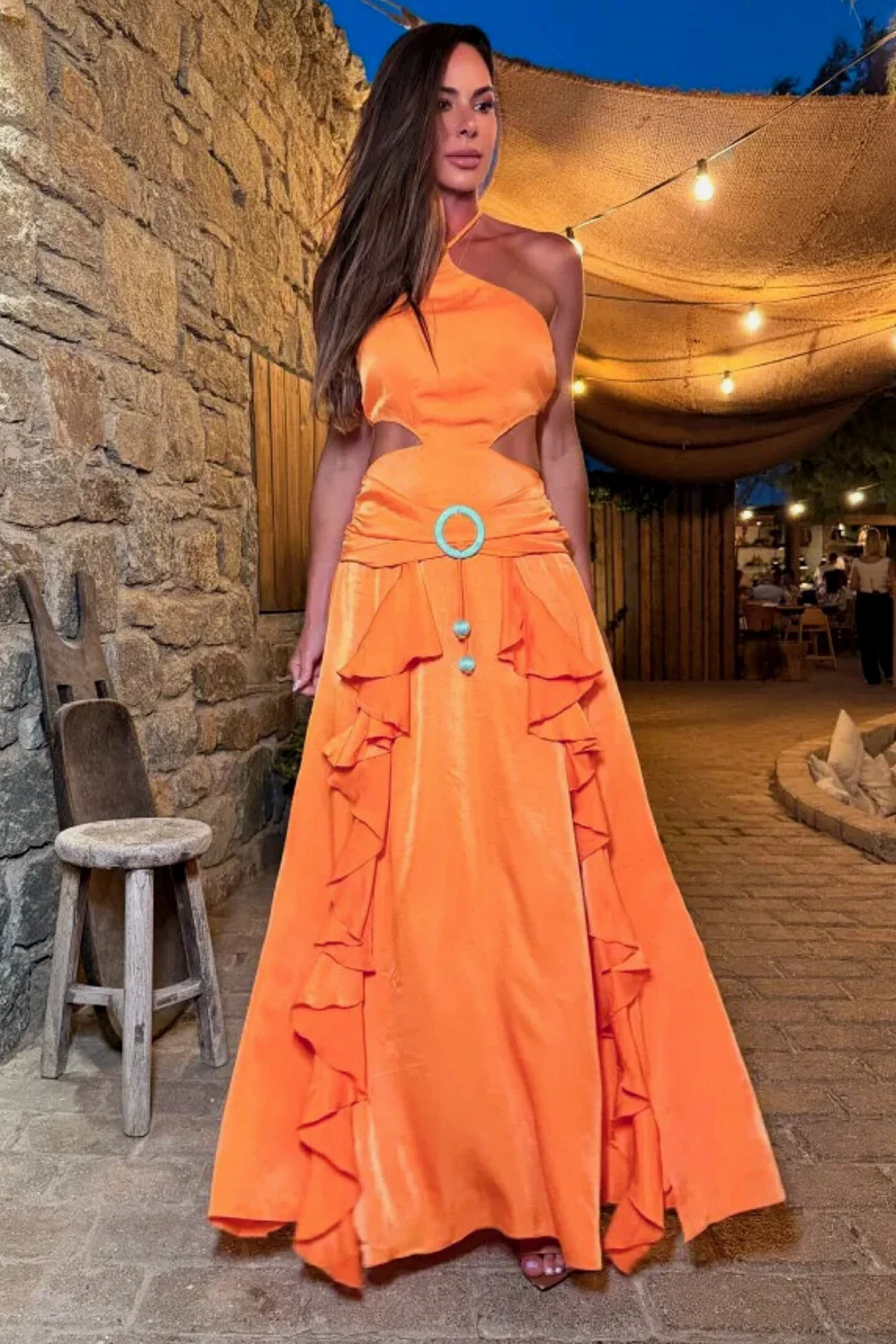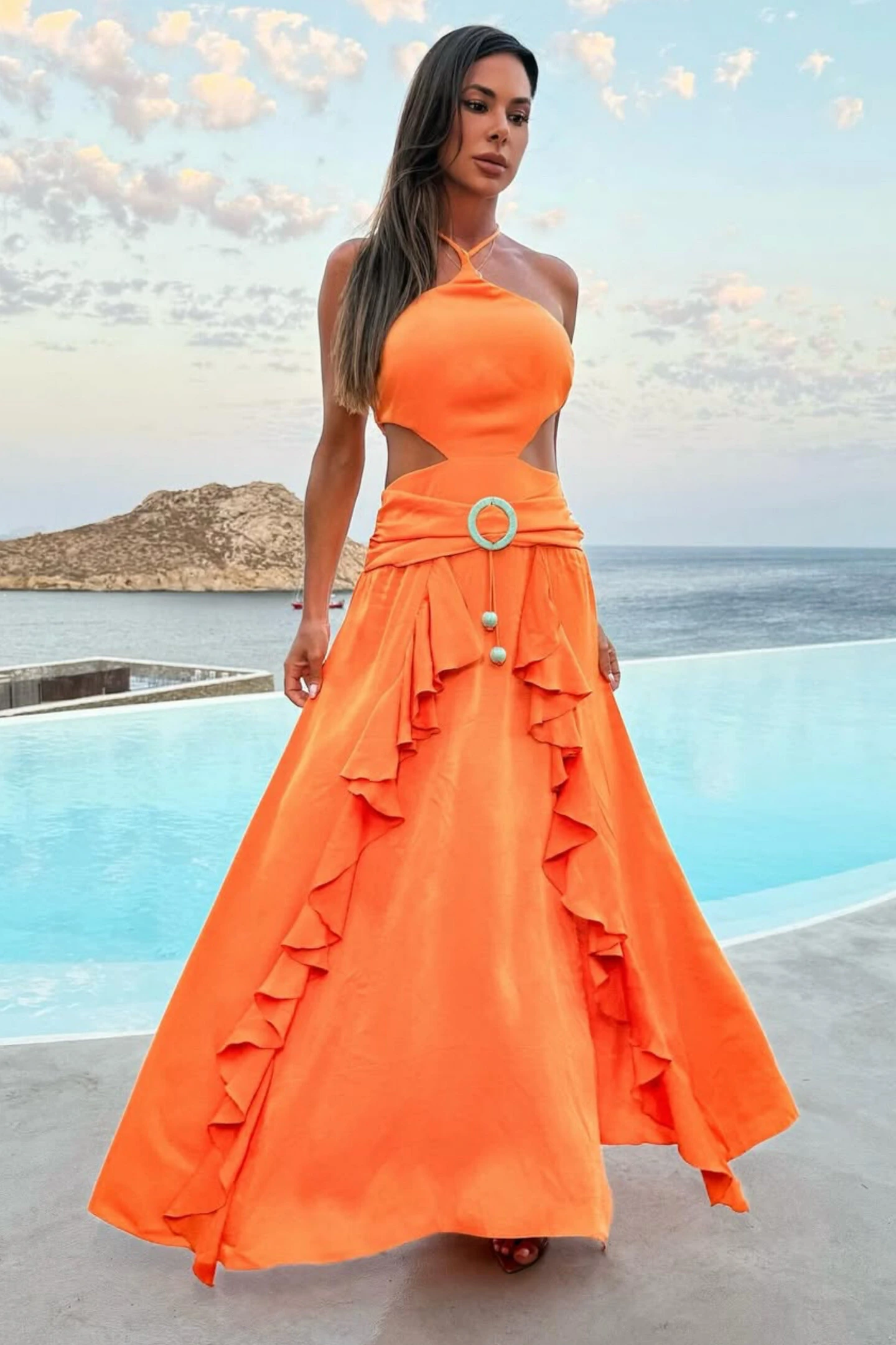 Maxi recorte na cintura e saia rodada com tecido vazado, conta com shorts embutido na própria peça para maior conforto.