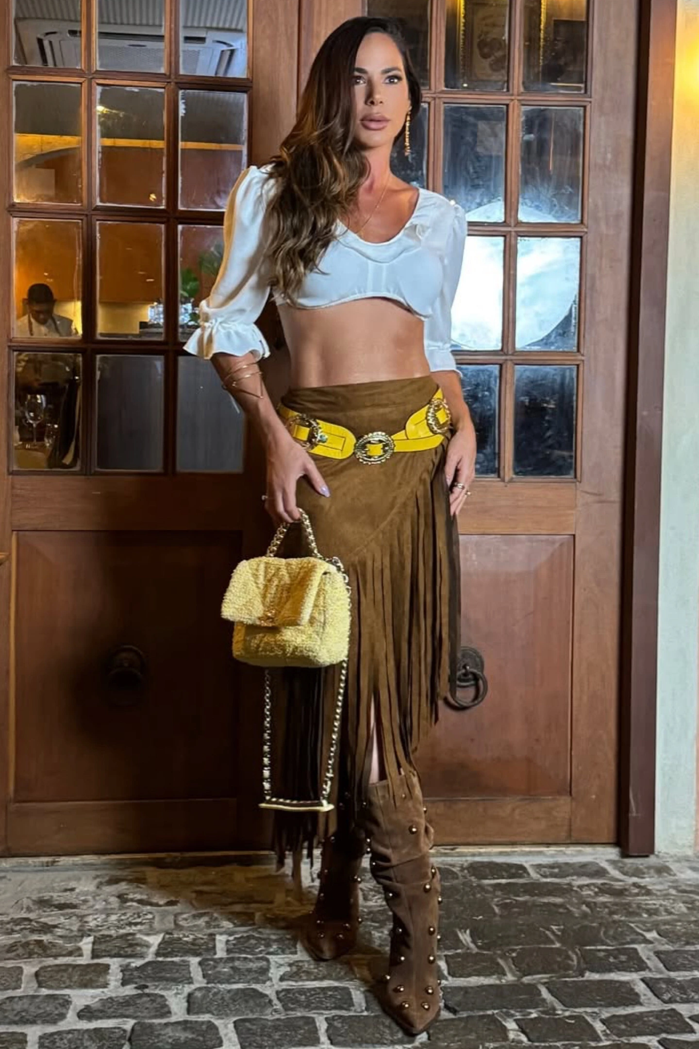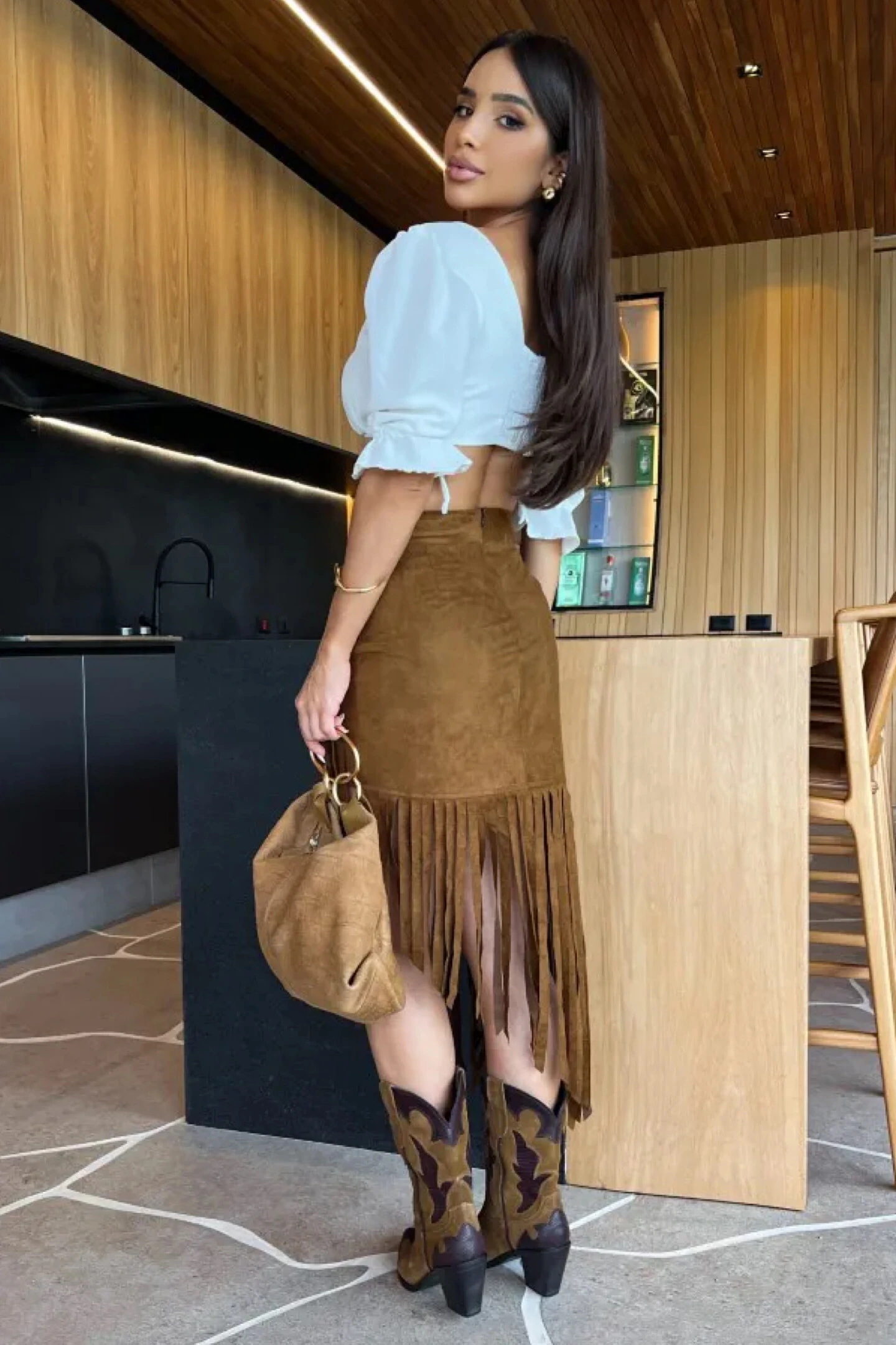 Saia midi alongada confeccionada em suede marrom. Conta com franjas assimétricas cortadas a laser que trazem movimento e estilo à essa peça. Fechamento em zíper invisível.