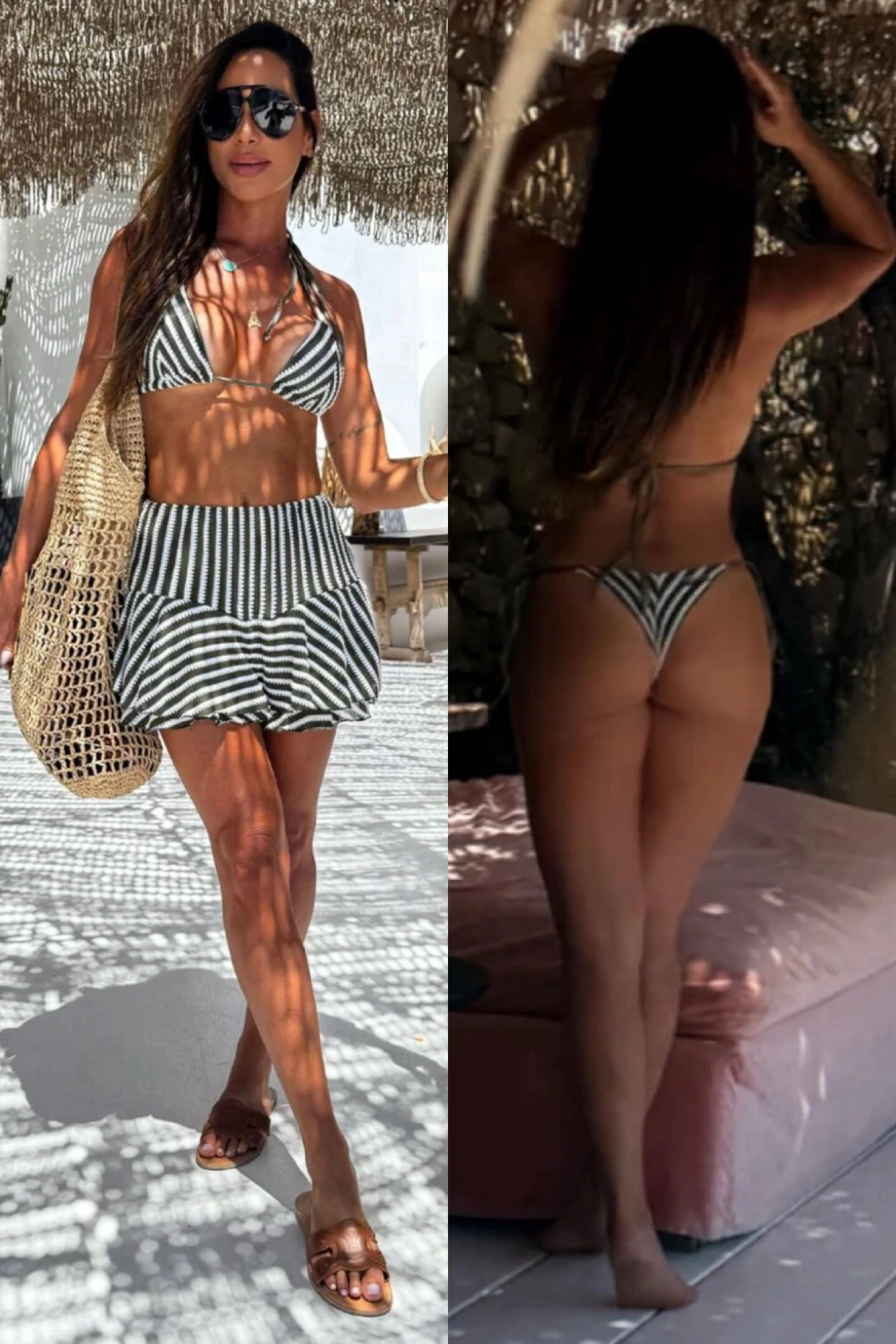Conjunto de biquíni com short-saia balonê - estampa listrada, super tendência da próxima estação.