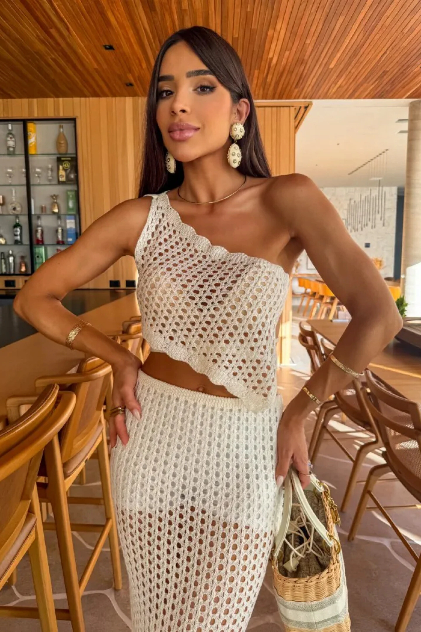 Conjunto Zuma é confeccionado em tricot com trama aberta em off white e tem modelagem assimétrica na parte do busto, criando um top de um ombro só, que permite diversas amarrações diferentes. Não contém bojo de forro.