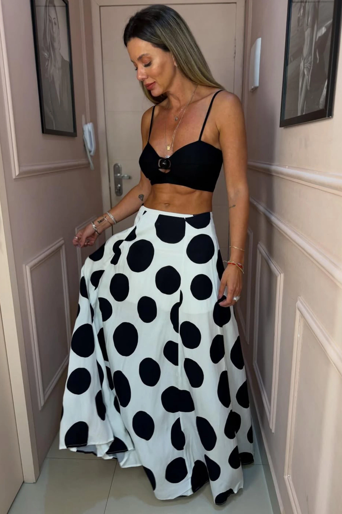 Saia longa com estampa poá (caimento perfeito) | Top cropped c/ recorte vazado.