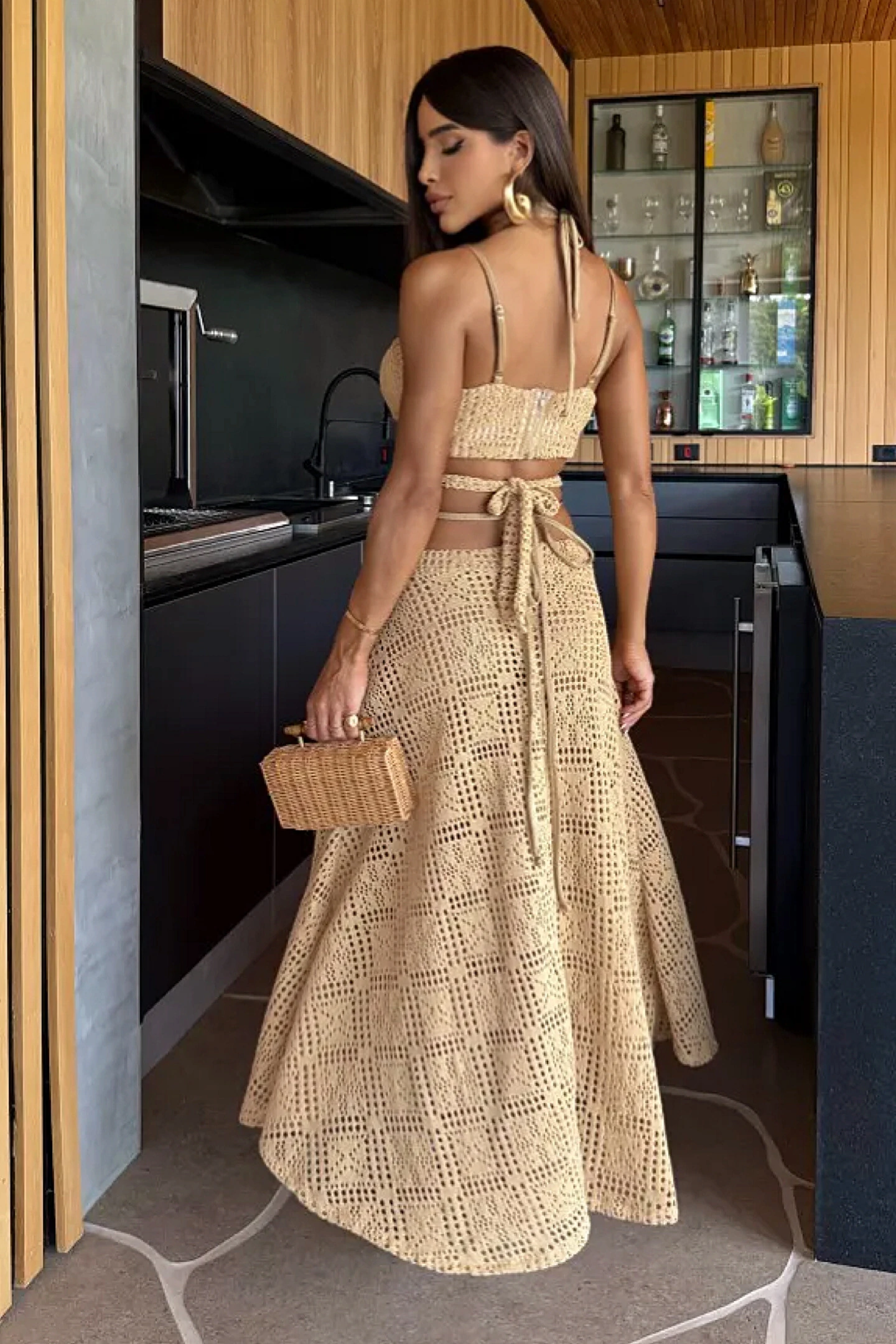 Saia midi alongada evasê com detalhes em resinas na altura da cintura que se amarram ao pescoço e nas costas.