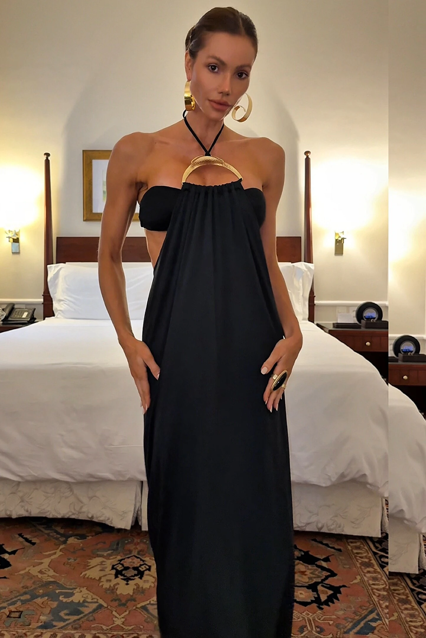 Look composto por top strapless e vestido midi em malha. O top é confeccionado em malha trilobal, com bojo estruturado e fechamento por ganchinho nas costas. O vestido, de modelagem reta em malha preta, traz um detalhe metálico dourado estilo gargantilha no colo, que valoriza a peça. Já costurado para sobrepor o top, conta ainda com amarração no pescoço, garantindo um visual moderno e sofisticado.