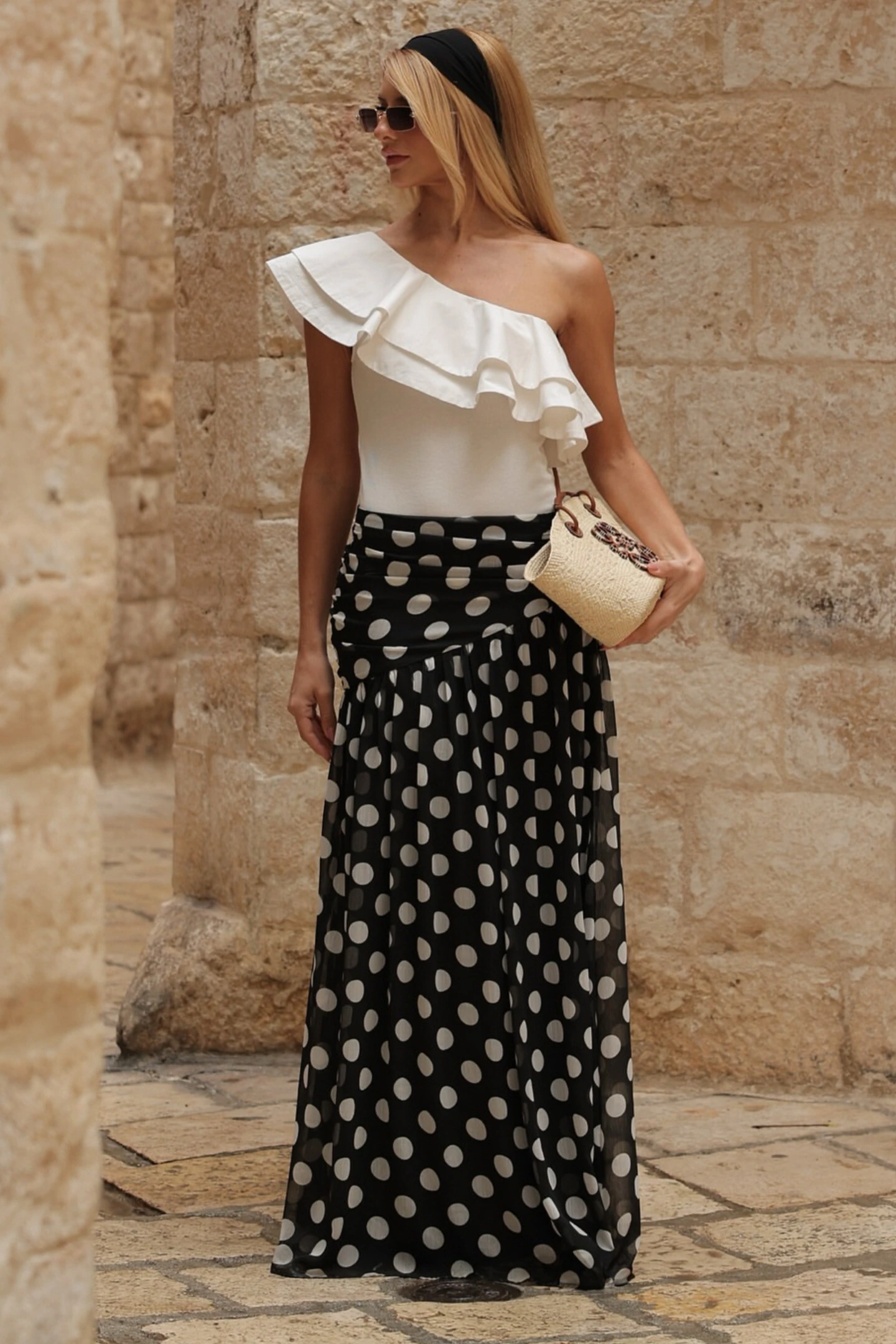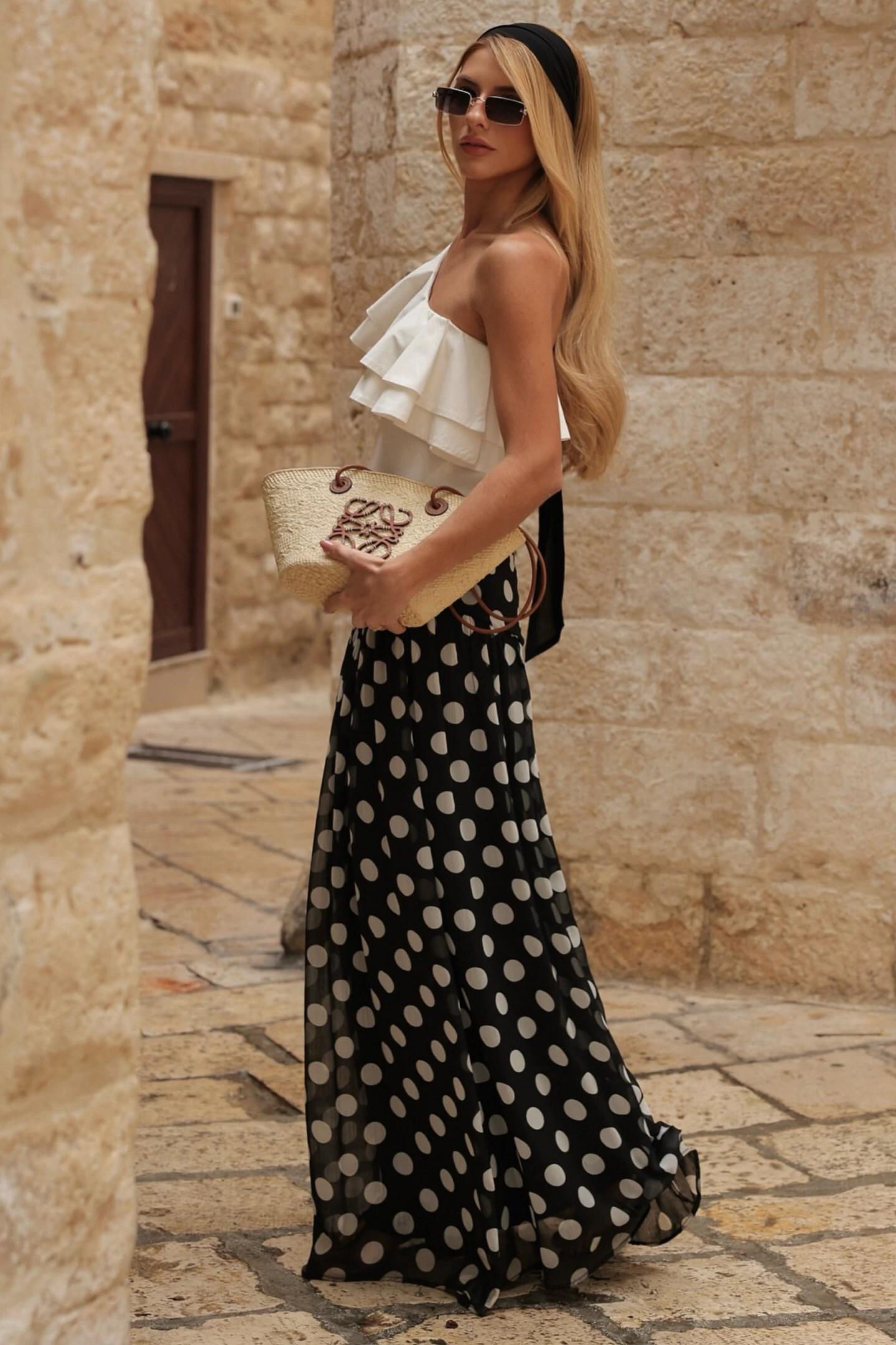 O vestido Aymé é confeccionado com tirinhas douradas completamente vazadas em seu comprimento. Possui gola alta estilo halter com fechamento em botões no pescoço.