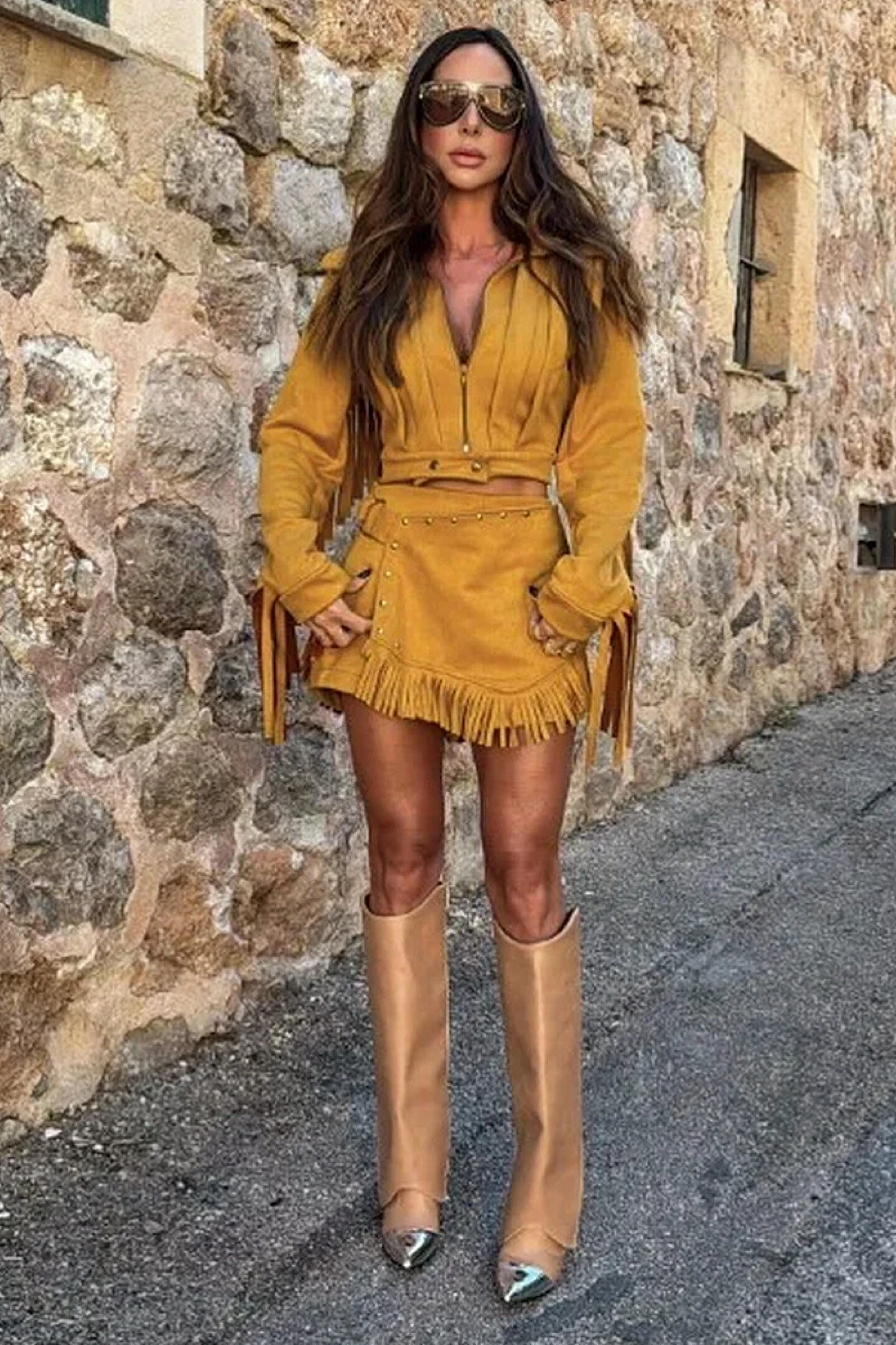 O short saia, com transpasse e fivela lateral, é realçado pelos rebites dourados, que adicionam um toque de brilho e sofisticação.Um conjunto que mistura o estilo western com muita elegância e personalidade.