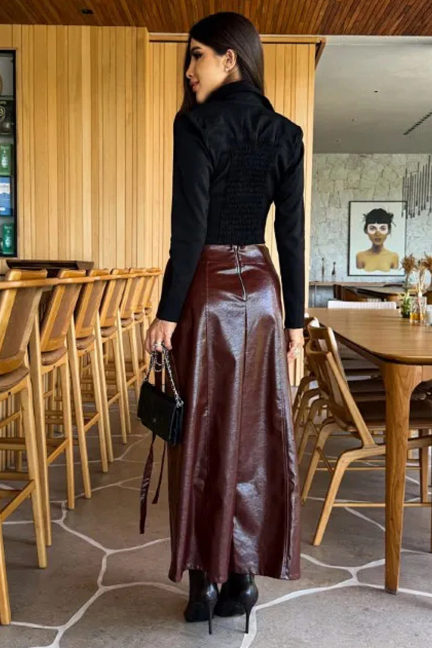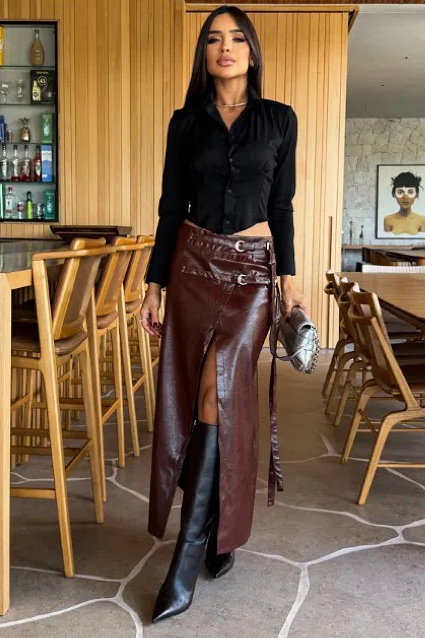 Saia confeccionada em couro de viscose na cor pinhão.