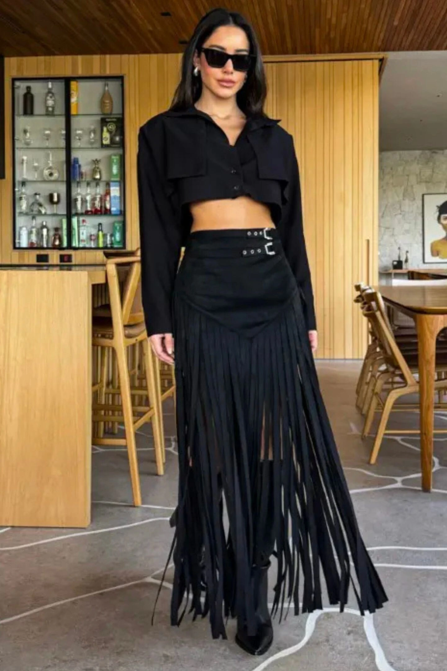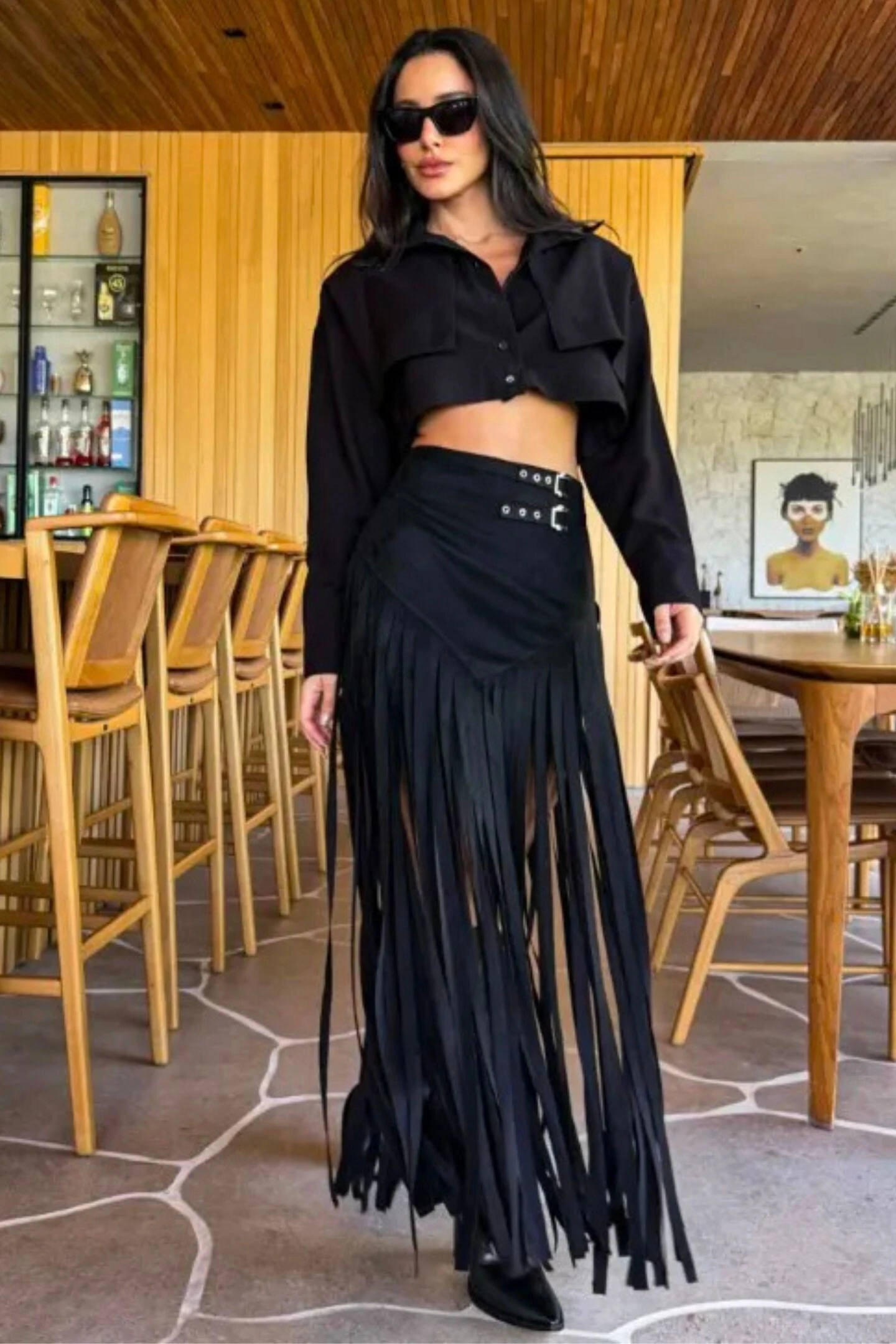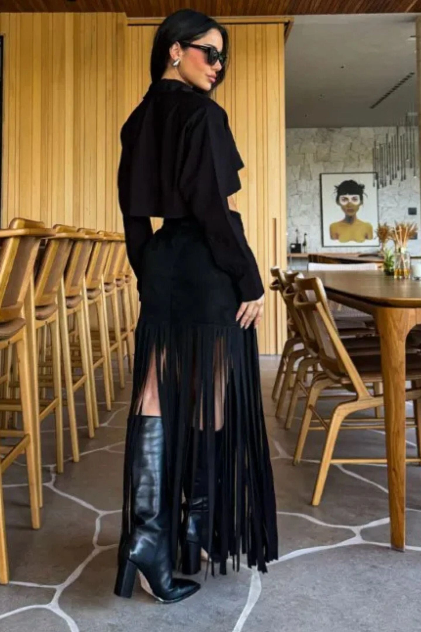 Saia com sobreposição de franjas longas cortadas à laser confeccionadas em malha suede preto.