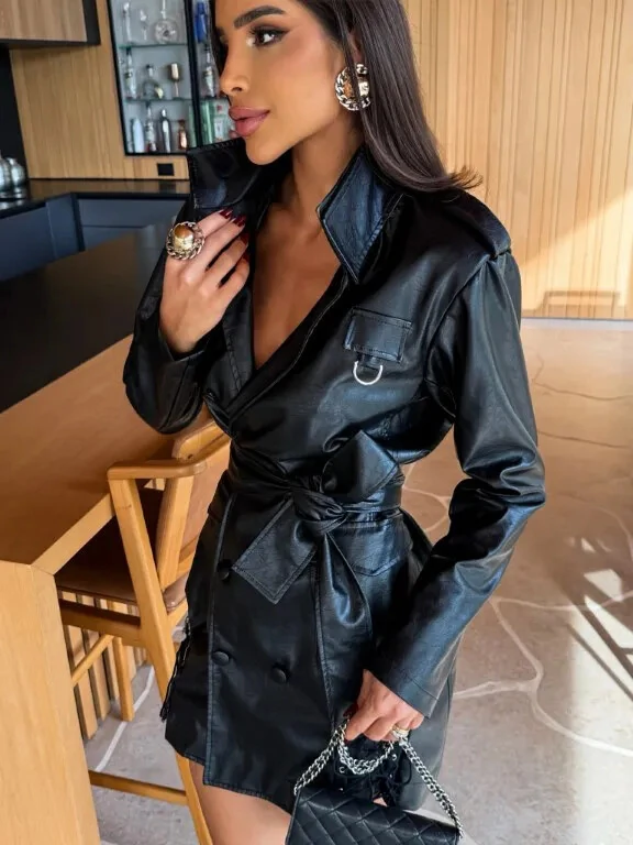 Vestido confeccionado em couro de viscose de alta qualidade na cor preta.