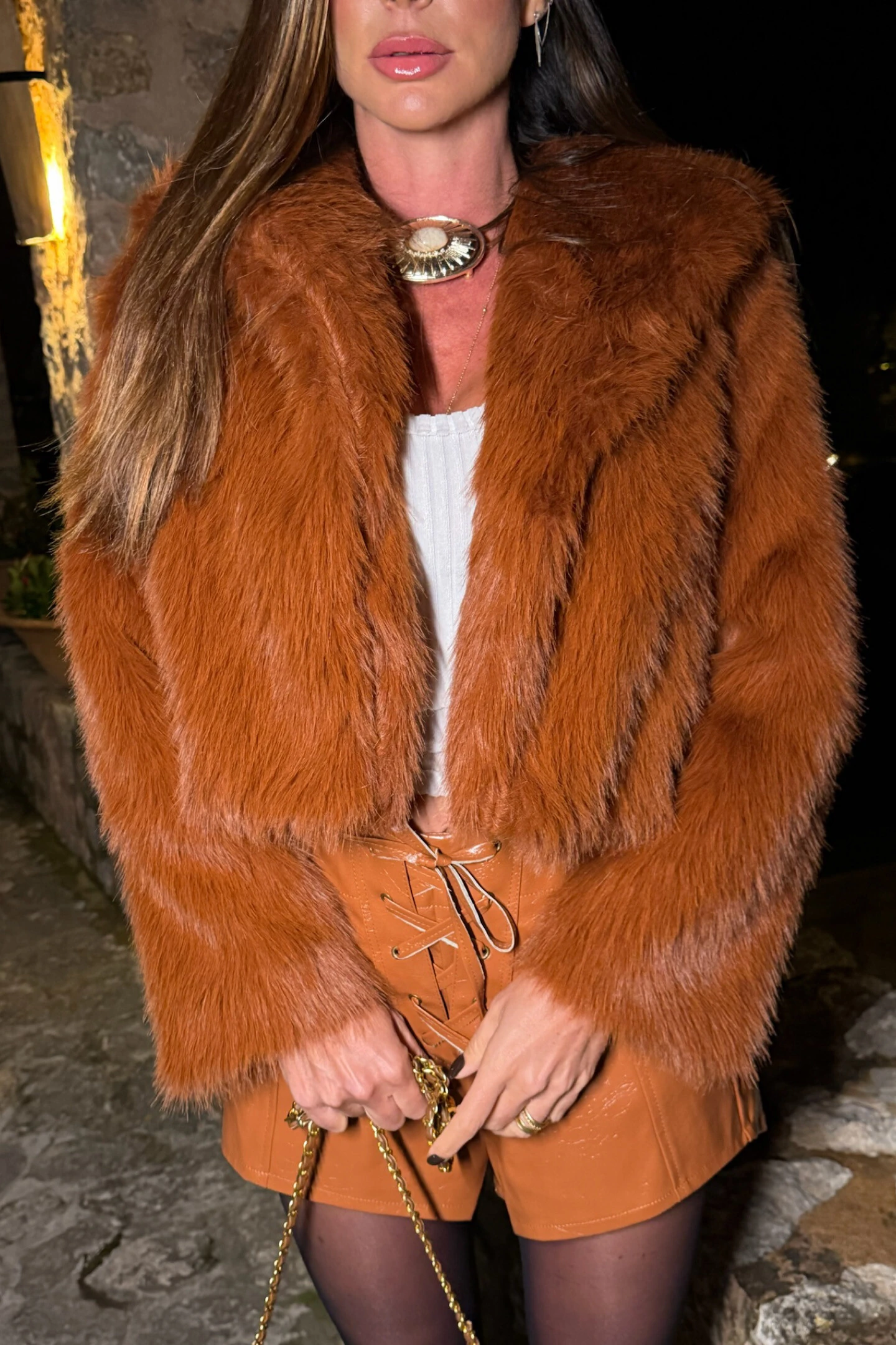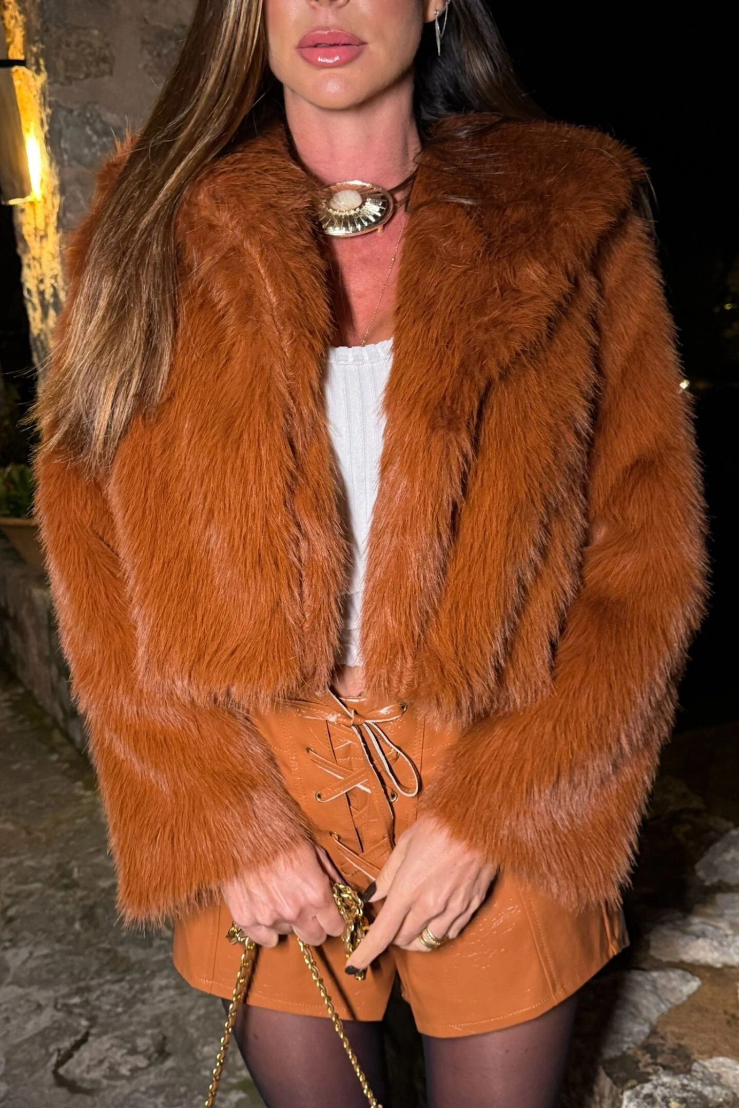 Casaco na cor caramelo/cognac em pelo sintético com toque macio, quente e extremamente confortável sobre a pele, ideal para os dias mais frios.