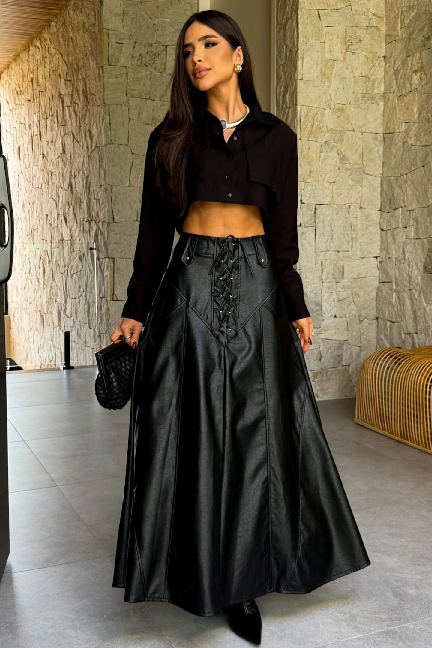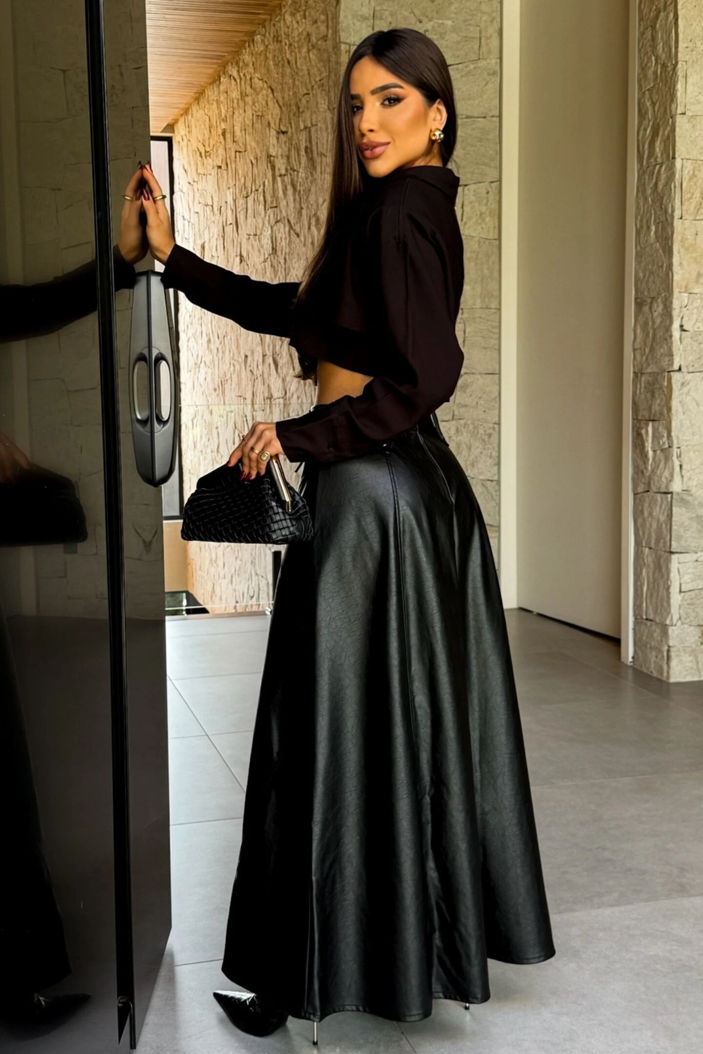 Confeccionado em couro de viscose preto.