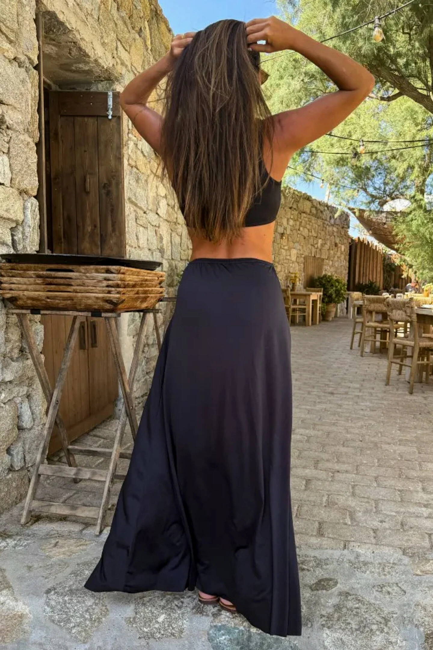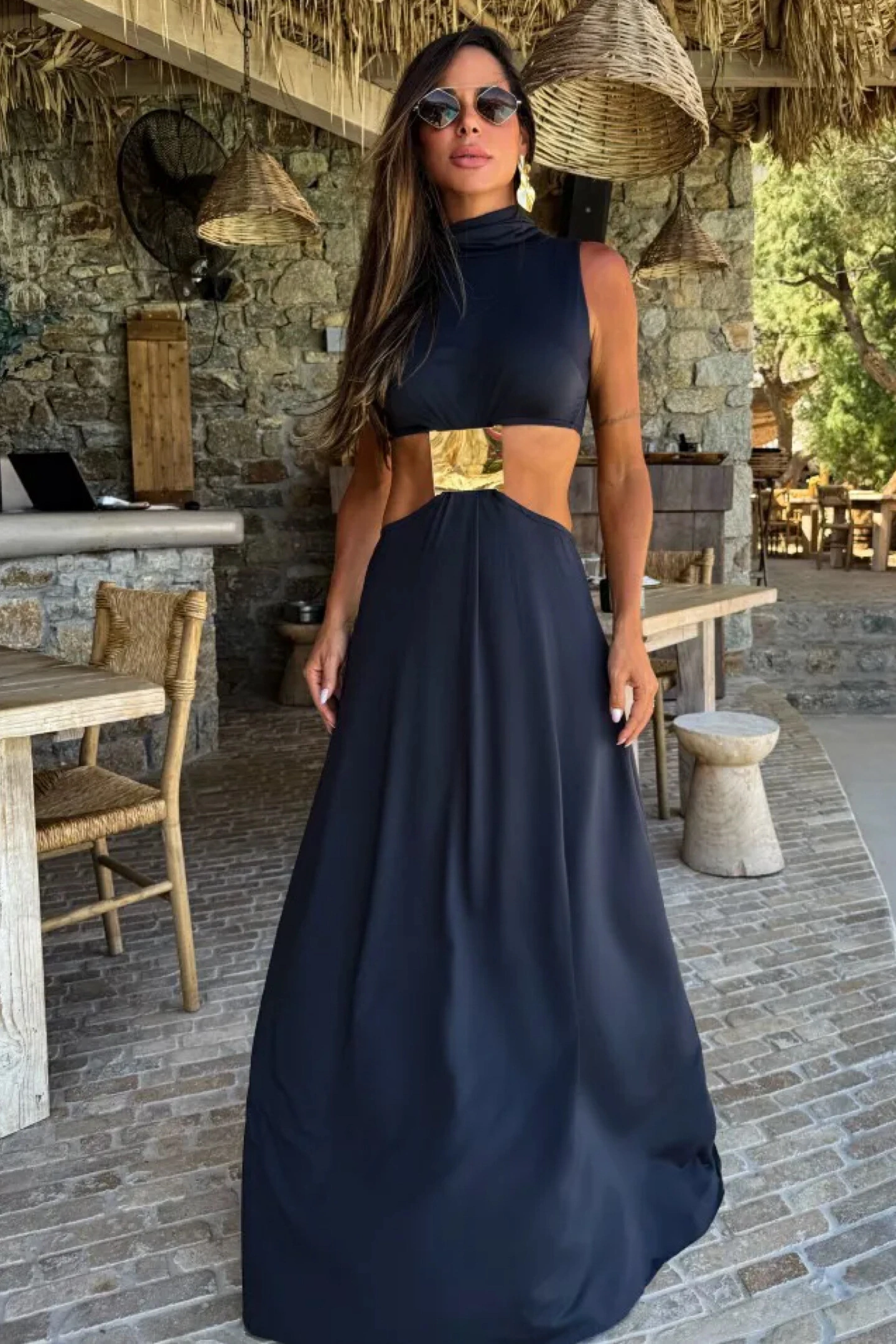 Cintura completamente descoberta e saia levemente rodada. O destaque da peça se dá pelo aviamento dourado central da peça, que traz um toque refinado para o todo. Sem bojo.