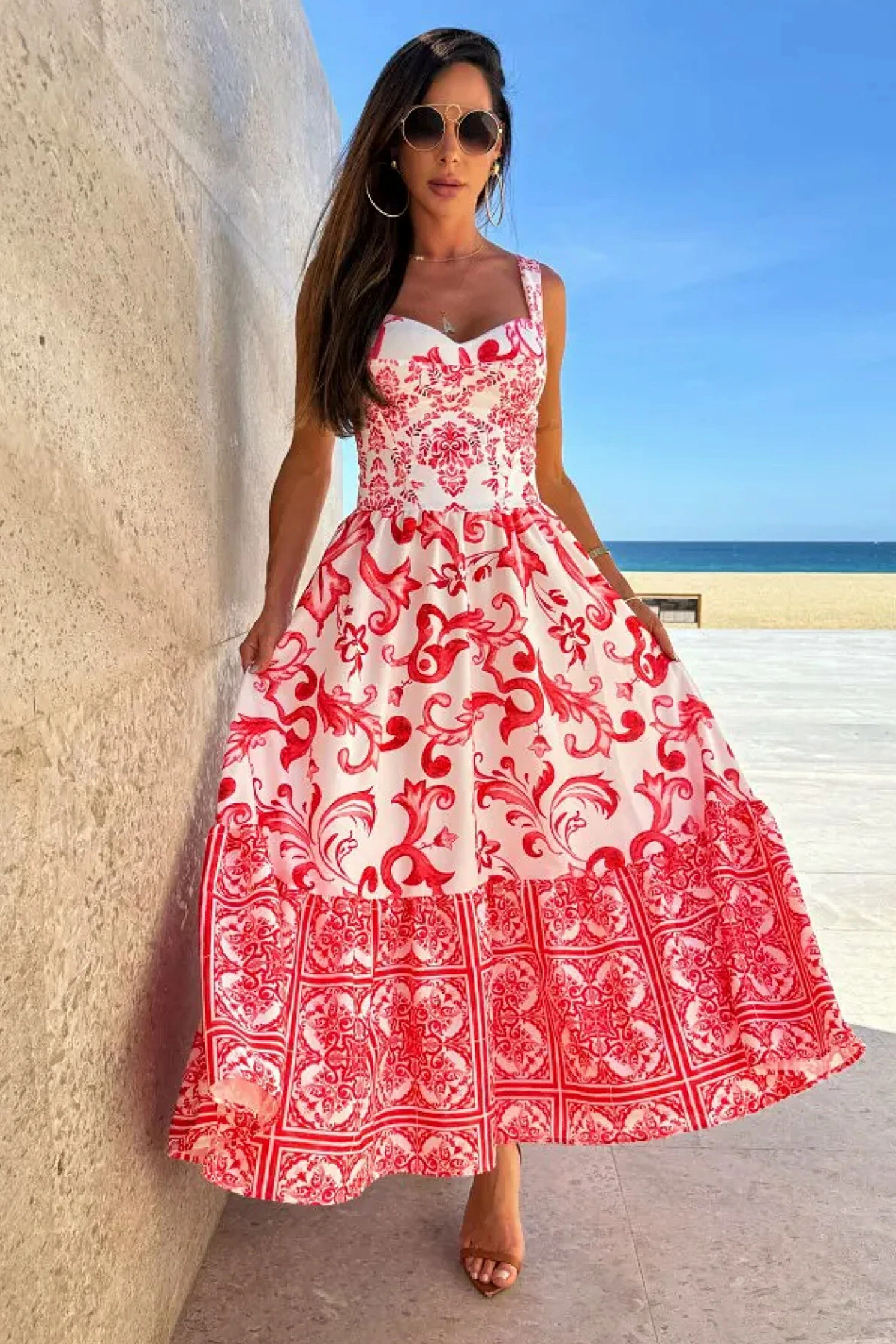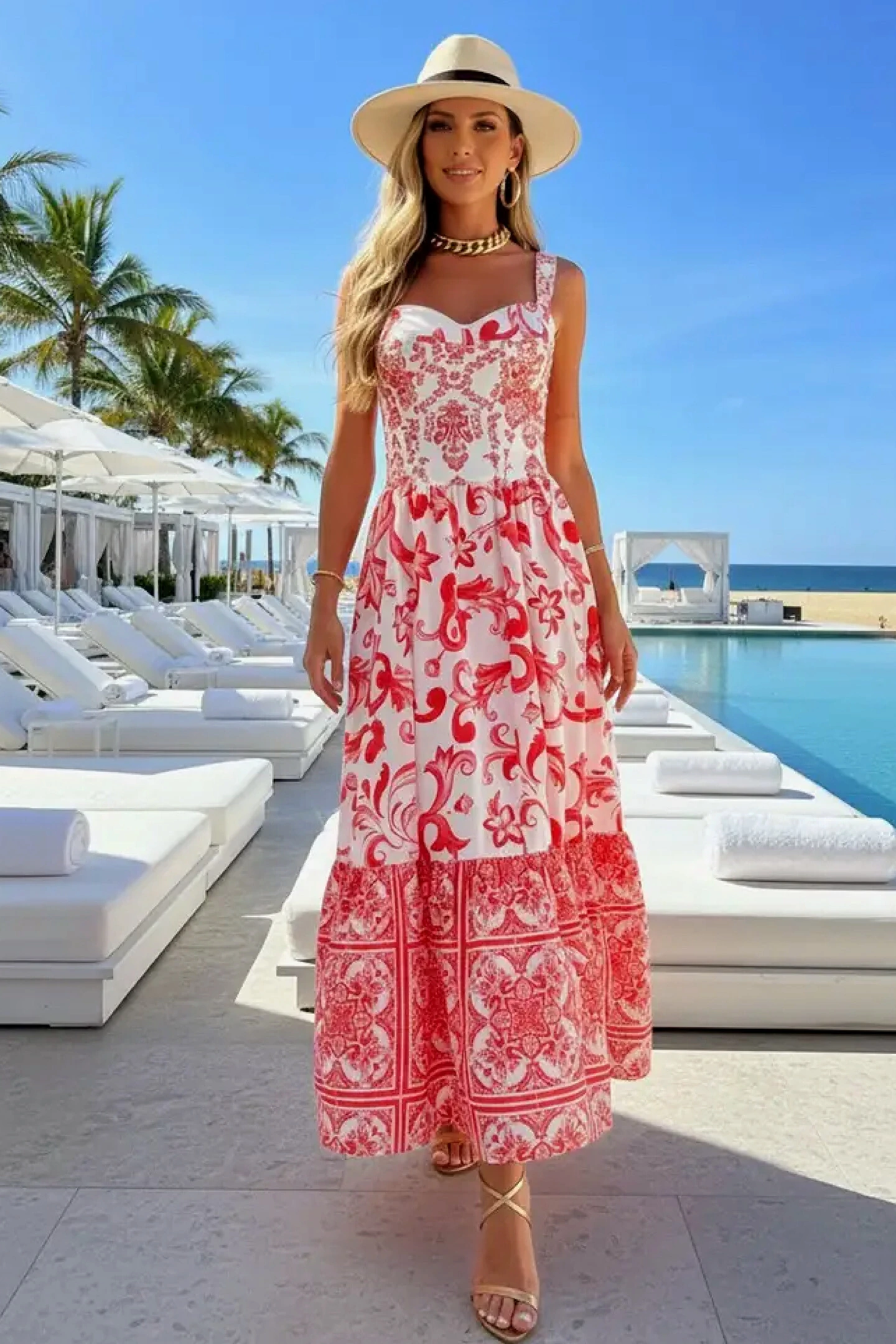 Vestido midi alongado strapless, com fenda lateral, confeccionado em crepe na cor off white com estampa maxi de flor.