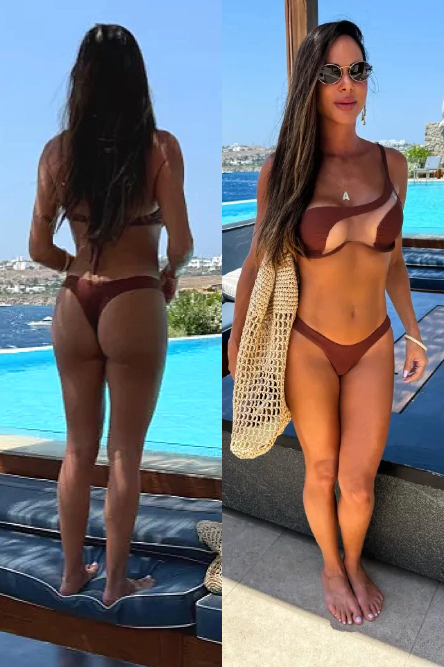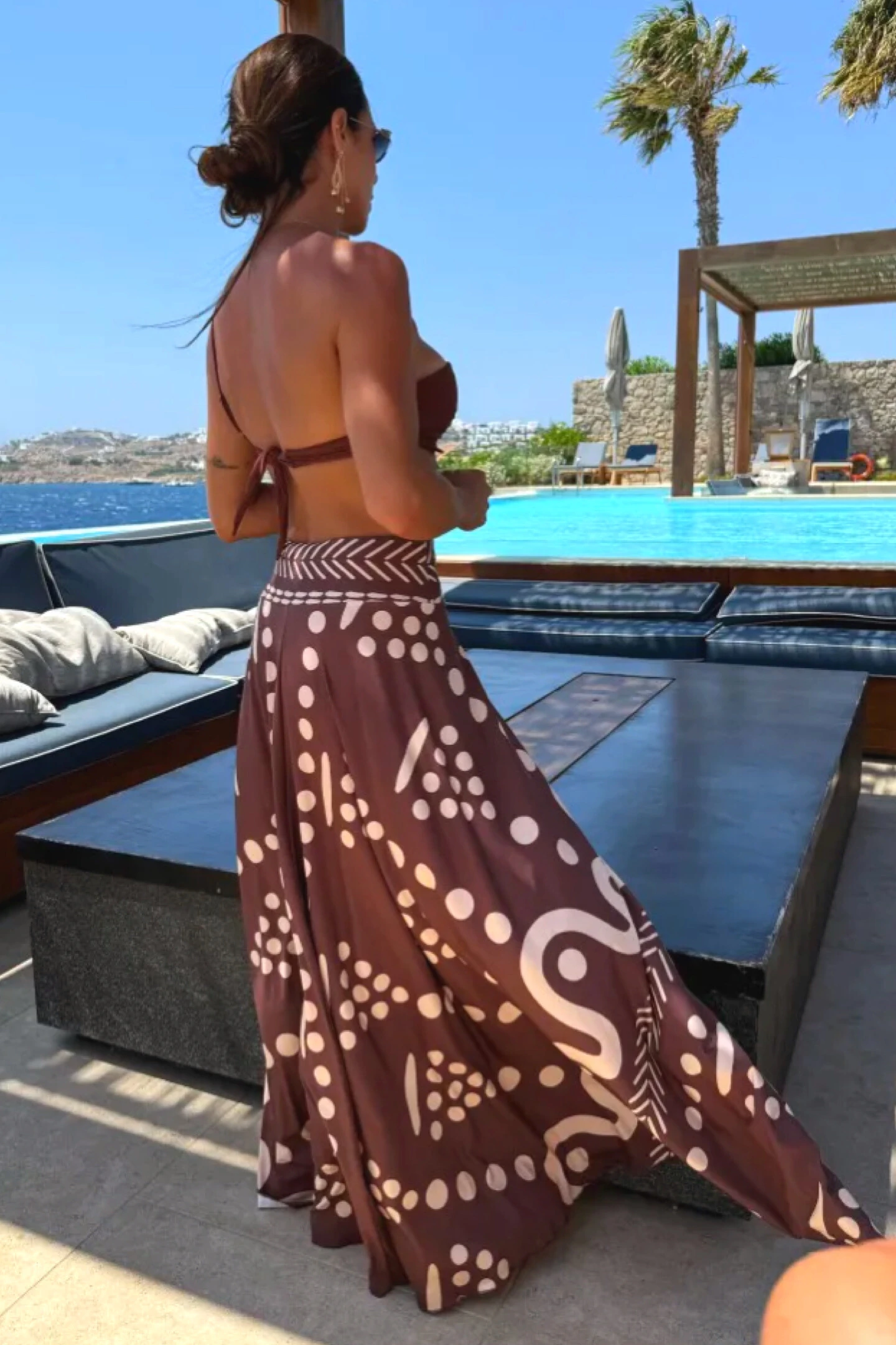 Conjunto de bíquini e saia estampada.