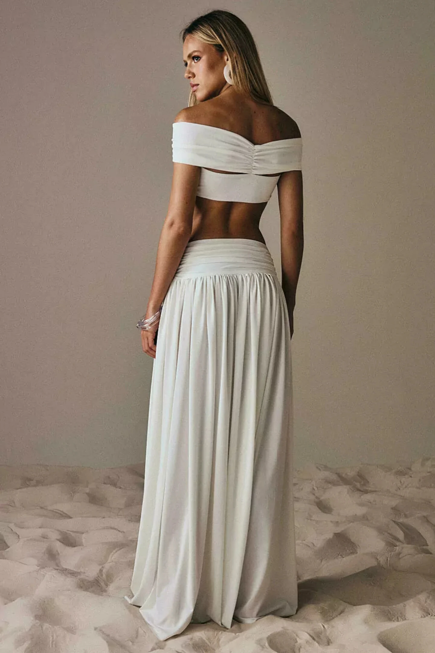 Conjunto em poliamida composto por saia longa com design de cós laço e cropped ombro a ombro. Aposte no look com uso de peças desmembradas e deixe seu look ainda mais versátil.
